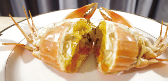 黃油相融,難分彼此。油膏浸滿(mǎn)整只蟹身,腹肉、蟹腿、蟹螯,甚至蟹腮,全身都金黃透光。細(xì)細(xì)品嘗,渾身散發(fā)一股霸道的鮮甜,是普通青蟹的10余倍,簡(jiǎn)直就是“人間尤物”。